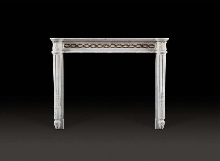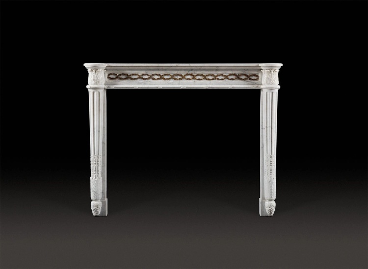 An antique 19th-century French Empire statuary marble fireplace of unusual design, decorated with Ormolu mounts. The rectangular shelf with rounded corners, the frieze with an inset moulded panel framed with running peal, with gilded, interwoven oval ormolu laurel wreaths. The jambs in the form of rounded, tapering and fluted, inverted Thyrus (a wand, attributes of the wine God Bacchus). Decorated with pine cones, symbols of fertility, and acanthus. The flutes stopped with foliate tendrils.