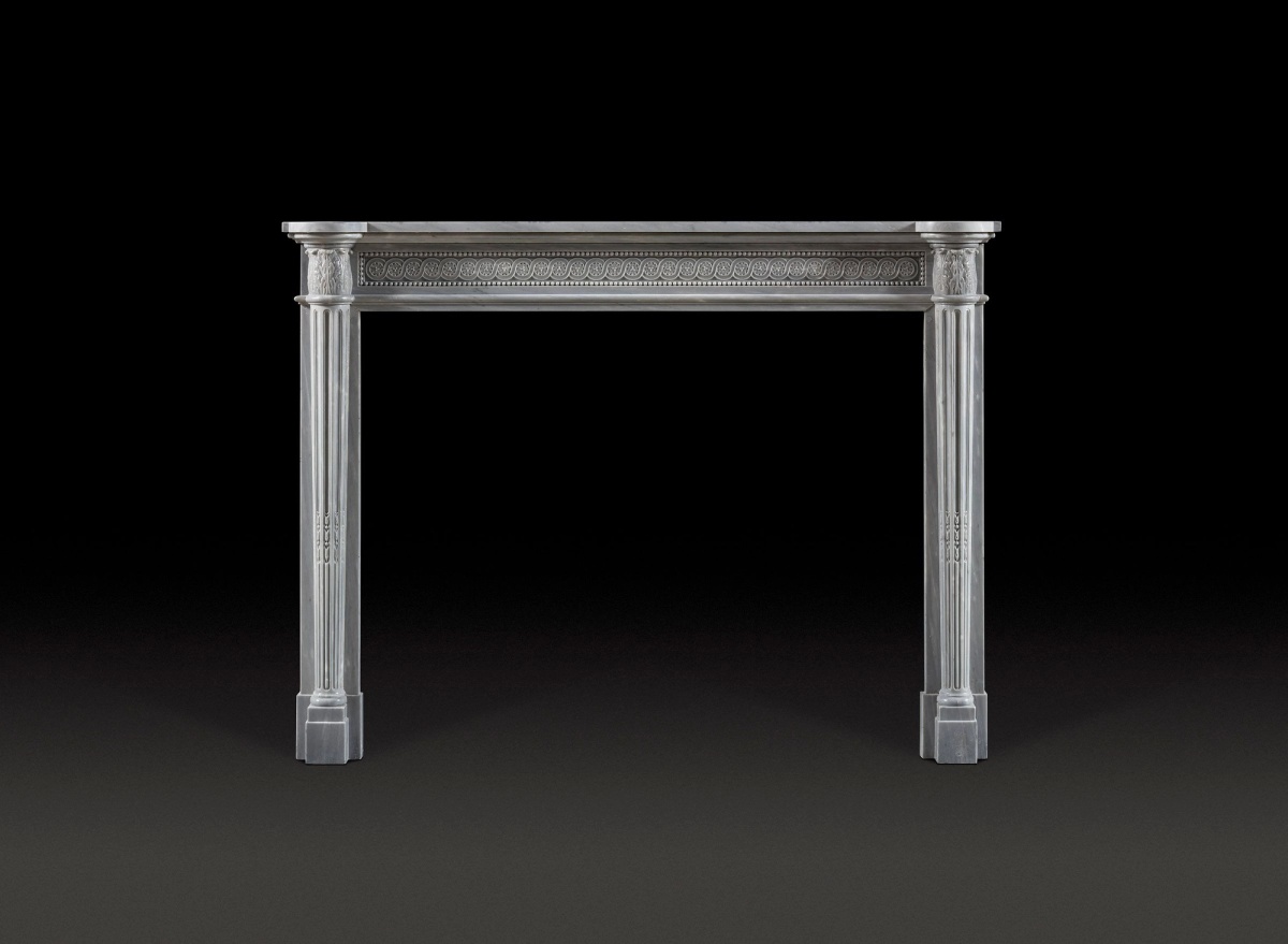 An exquisitely executed Louis XVI style chimneypiece in Italian Bardiglio marble, the running guilloche frieze flanked by filled fluted column jambs capped by Acanthus capitals.