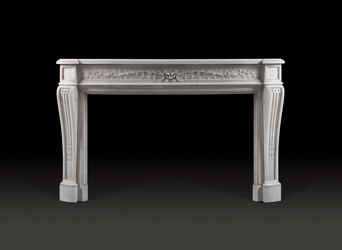 An exceptional, highly carved 18th century Louis XVI chimneypiece in statuary white marble of generous proportions. The bowed frieze carved with running oak leaves bordered with delicately executed beading, centred by ribbons tied in bows. The angled corner blocks sit above console jambs carved with three stopped flutes filled with carved flowers.