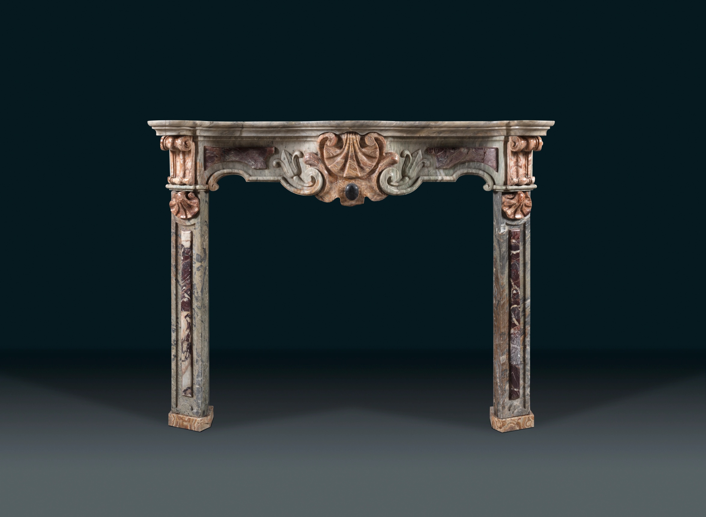 A 17th century Italian Baroque chimneypiece carved in variegated marbles; Swedish Green with inlays of Rosso Levanto, Breccia Pernice, and Breccia Medicea. The central cartouche features a scallop shell, a symbol of love and fertility connected with Venus, and single Ovo in Belgium Black marble. These are flanked by C-scroll corner blocks and scallop shell motifs again. The footblocks are carved in Onyx. Baroque design emphasized theatricality and grandeur. This piece likely originated in a noble palazzo, embodying the Counter- Reformation's emphasis on splendour and divine symbolism.