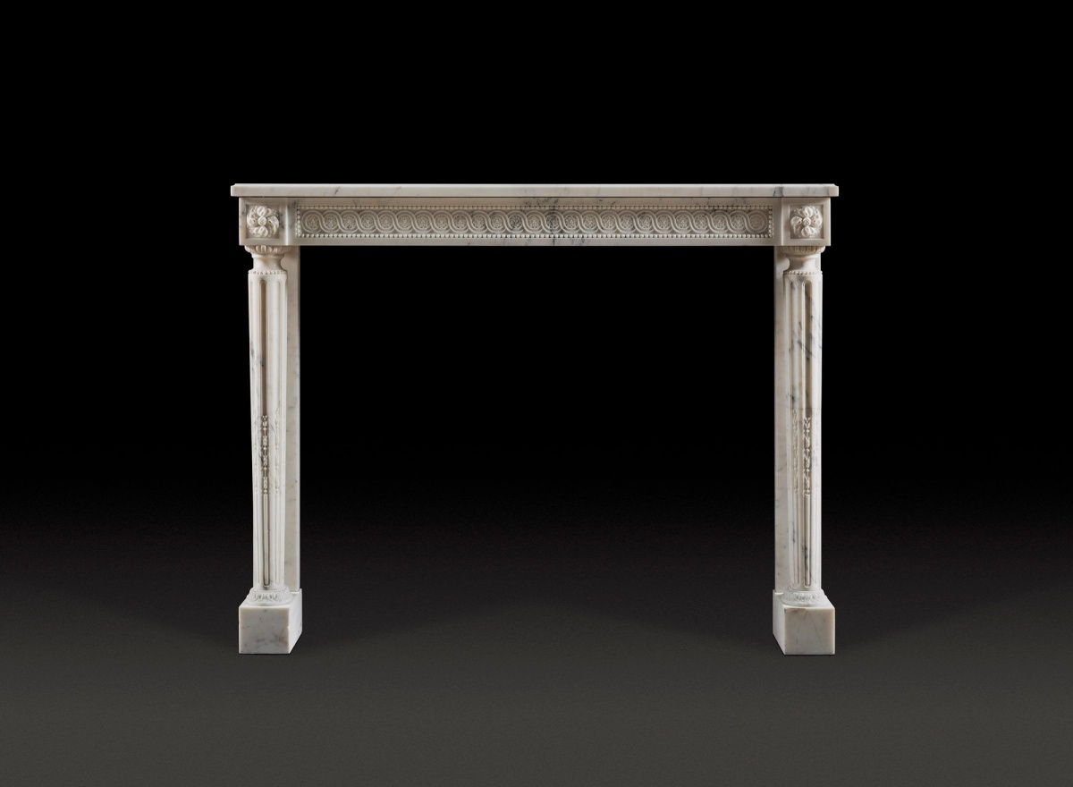 A very elegant Louis XVI style fireplace carved in Carrara marble, the running guilloche frieze flanked by paterae cornerblocks, supported by filled fluted column.