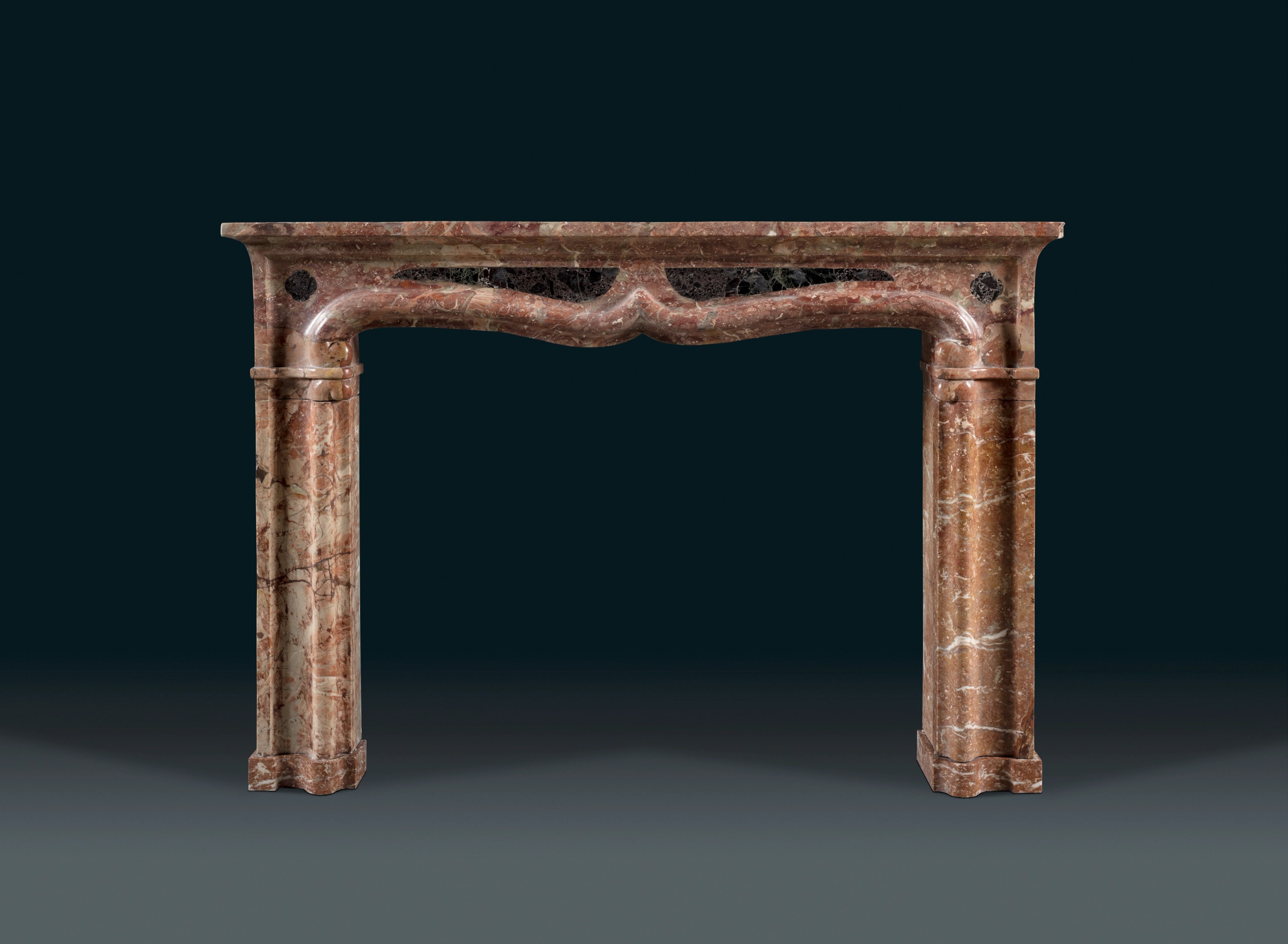 A 17th Century small-scale Italian chimneypiece carved in Breccia Pernice, with Pietra Dura inlays of Verde Antico forming quatrefoil details. The frieze and shelf are carved in the solid, and the serpentine bolection moulding terminates in bun feet mirrored at the jamb tops. Quatrefoils, symbolic of harmony and balance, were popular in Renaissance and Gothic revival design. The use of rare stones and intricate inlay reflects the 19th century's fascination with craftsmanship and decorative complexity.