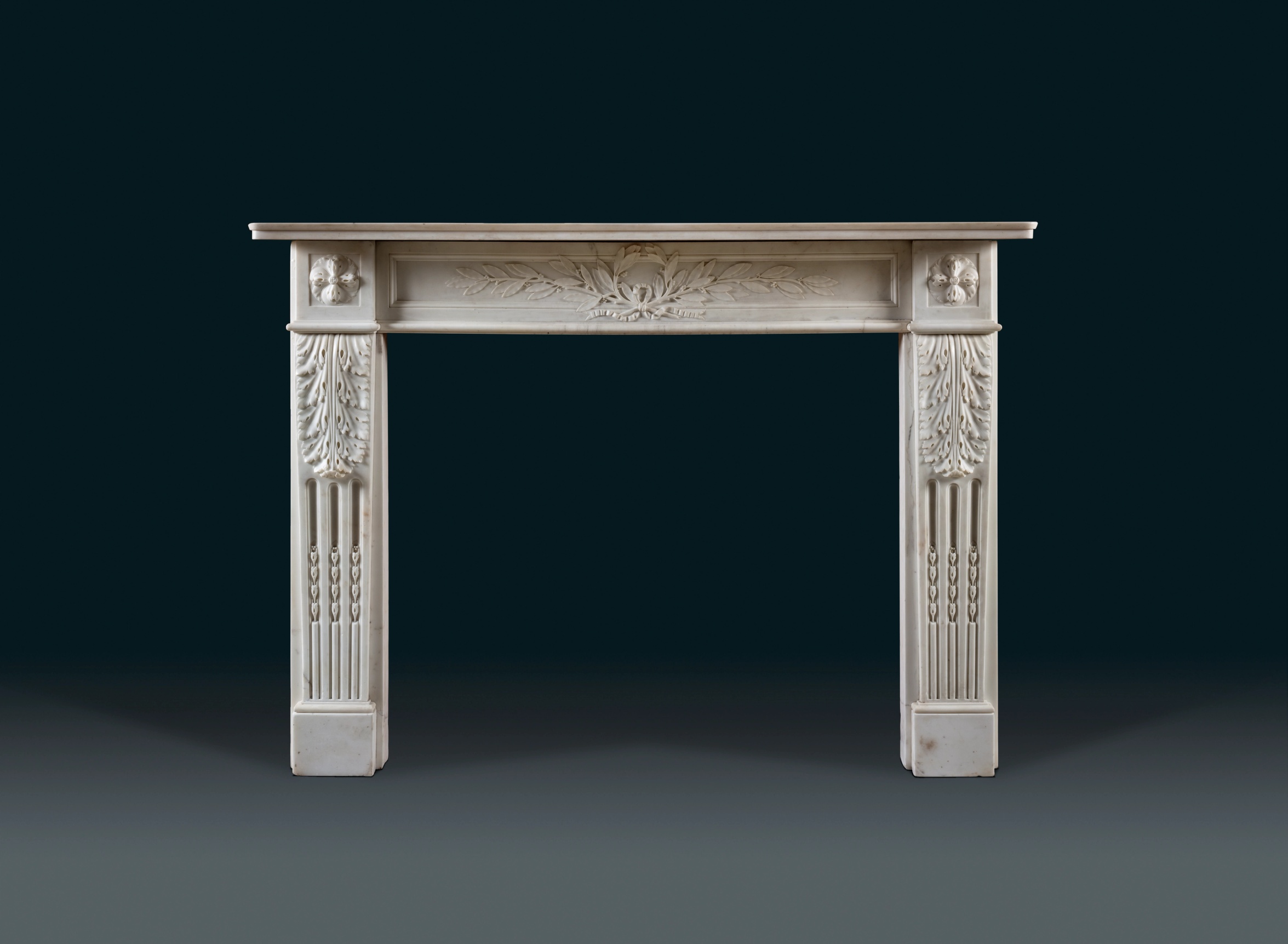 A rare English Statuary white marble chimneypiece, richly carved in the Louis XVI style. Ebullient acanthus leaves over tapering bell flower filled stop-flutes adorn the jambs. The well-proportioned frieze centres a finely worked wreath of laurel on a fielded panel, and the corner blocks are inlaid with rosettes. The chimneypiece's overall shallow projection, indicative of the architectural scale of Georgian interiors, bellies its intrinsic Englishness. Provenance: Eaton Square, Baroness Rawling.