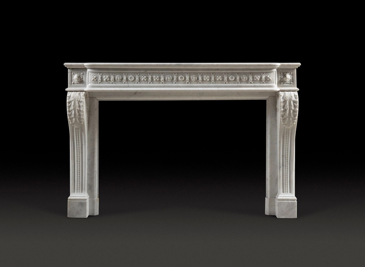 An attractive 19th century chimneypiece of substantial width and proportion, in Louis XVI style. The console jambs are splendidly carved with acanthus and with beading running down a central vale. The corner blocks are similarly carved with acanthus rosettes, and a breakfront frieze is highly decorated with symmetrically organised and variegated floral motifs, beginning at the centre with a sunflower and with flanking pairs running out. The humble sunflower is said to spread hope and happiness.