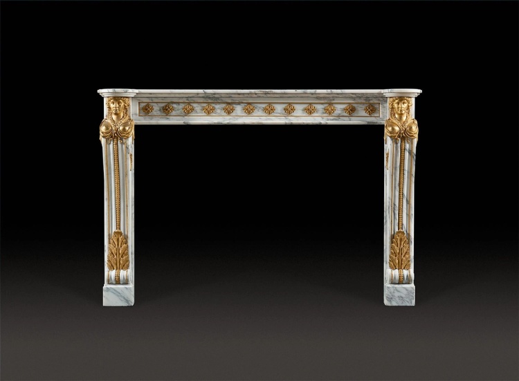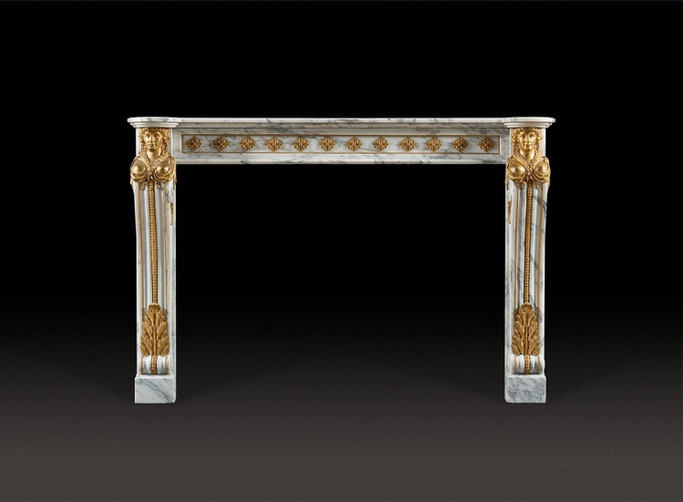 A French Louis XVI style antique fireplace in veined statuary marble with impressive and well-cast gilt bronze mounts. The rectangular shelf with rounded ends. The frieze with well-cast ormolu flower heads applied to the marble frame, the console shaped scrolled and fluted jambs surmounted with gilt bronze torsos of breasted Greek maidens with coiffured hair and mounted with lush acanthus leaf decoration above the foot blocks. Circa 1870.
