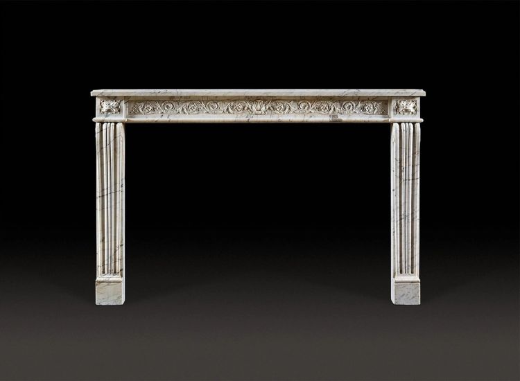 A delicately carved Louis XVI, Neoclassical fireplace in veined statuary marble.