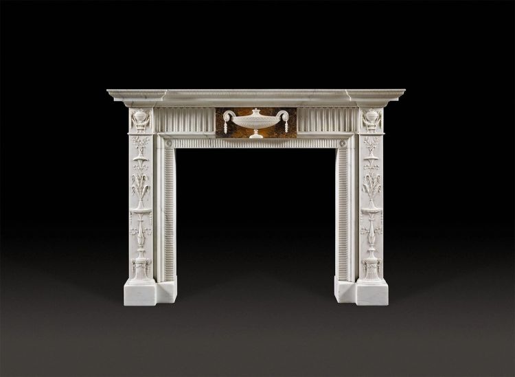 A Neoclassical antique fireplace, in the Adam Wyatt manner, in statuary on Sienna marble. The breakfront, moulded shelf above the frieze which is centred with a tablet carved with tazza shaped, lidded urn in statuary on Sienna marble. This is flanked by bands of flutes; the blockings above the pilaster, arabesque decorated jambs with draped, circular urns on legged pedestals. The whole raised on foot blocks.