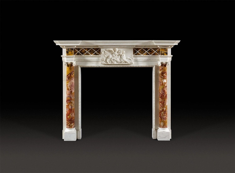 A Characterful George III column Chimneypiece in Statuary, Sienna and Jasper Marbles.