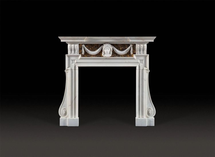 A good 18th century Palladian fireplace in statuary and Siena marbles after an original design by Inigo Jones, adapted by William Kent or one his disciples, possibly John Vardy. Circa 1740–45. The stepped and moulded breakfront shelf above an eared surround. The frieze centred with a well carved mask of the Sun God, Apollo, portrayed as a young beardless man flanked by drapery swags in statuary on a rich, dark Siena marble veneered background. The bracket shaped end blockings decorated with three calyx pods of acanthus. The jambs with elongated bracket shaped consoles with spiral volutes on the out grounds to the sides. The whole resting on footblocks. The central carving 20 century in date. A comparable chimneypiece is in the Parlour Room at Rousham, Oxfordshire.