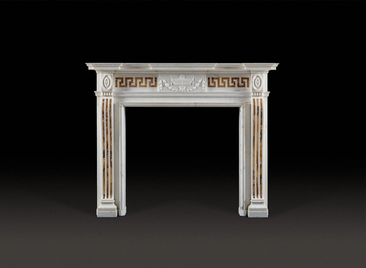 A statuary and Sienna fireplace of late 18th century Neoclassical design, the frieze with a statuary marble tablet decorated with a classical urn and swag flanked by Siena inlaid frets, and the console-shaped jambs inlaid with Siena flutes.