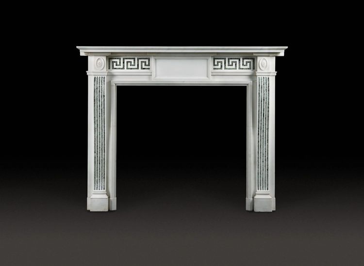 A 19th century statuary and Antico Verde marble fireplace in an earlier Neoclassical style. With a tiered and moulded shelf above the double Greek key frieze, centred with a panelled plain centre tablet. The flanking rectangular blockings with oval paterae decoration, upheld by the pilaster console tapering jambs, each inlaid with Antico Verde on ogee socles. Circa 1850.