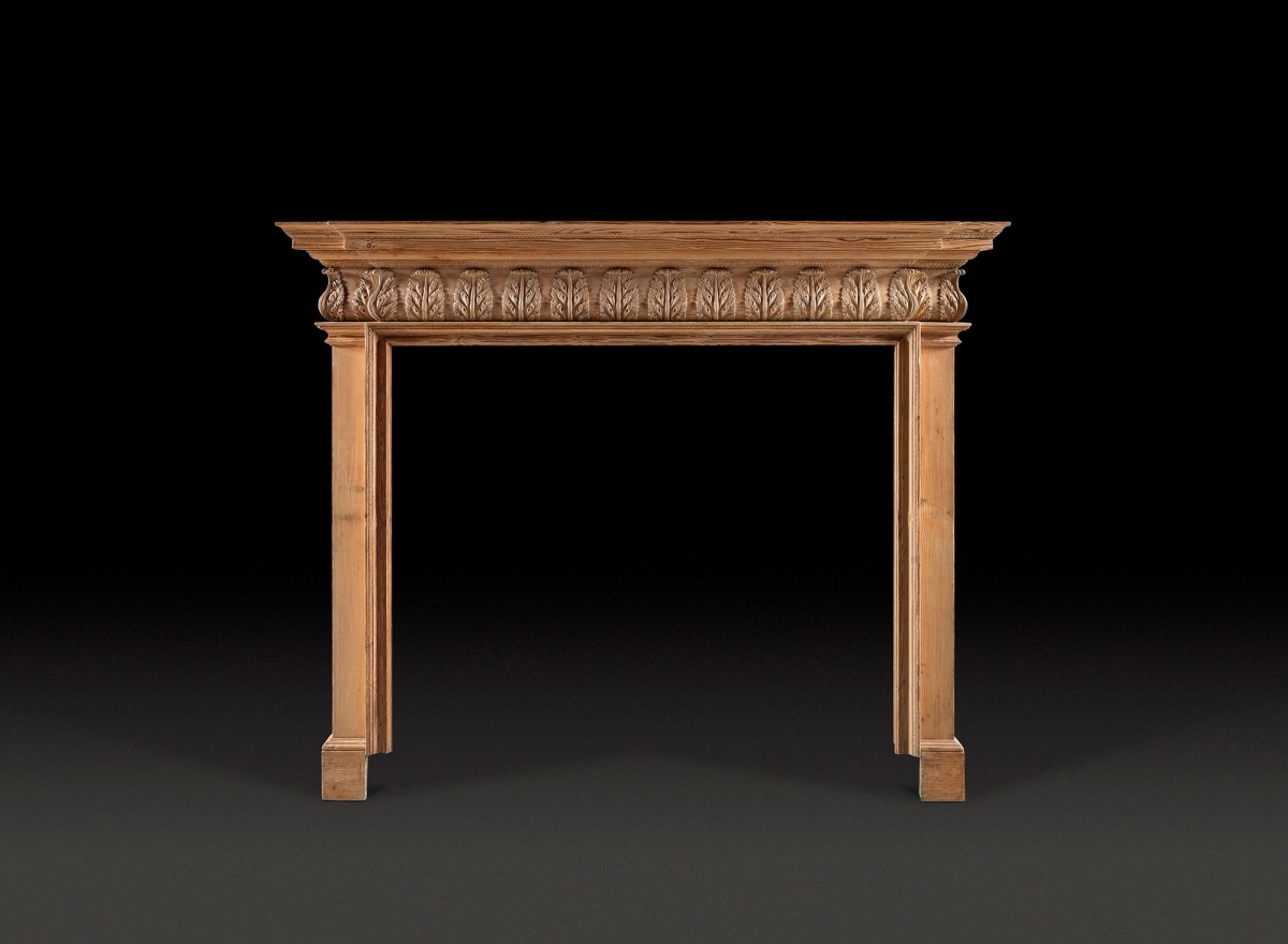 The stepped moulded shelf is punctuated with delicately executed acanthus and a bold acanthus leaf frieze. In exemplary condition having been stripped back to the raw pine, this chimneypiece was originally carved for Constable Burton Hall, a Georgian Country House in North Yorkshire designed by the architect John Carr in 1768. The house was commissioned by the Wyvill family who still privately owns it. With minor replacements to footblocks.