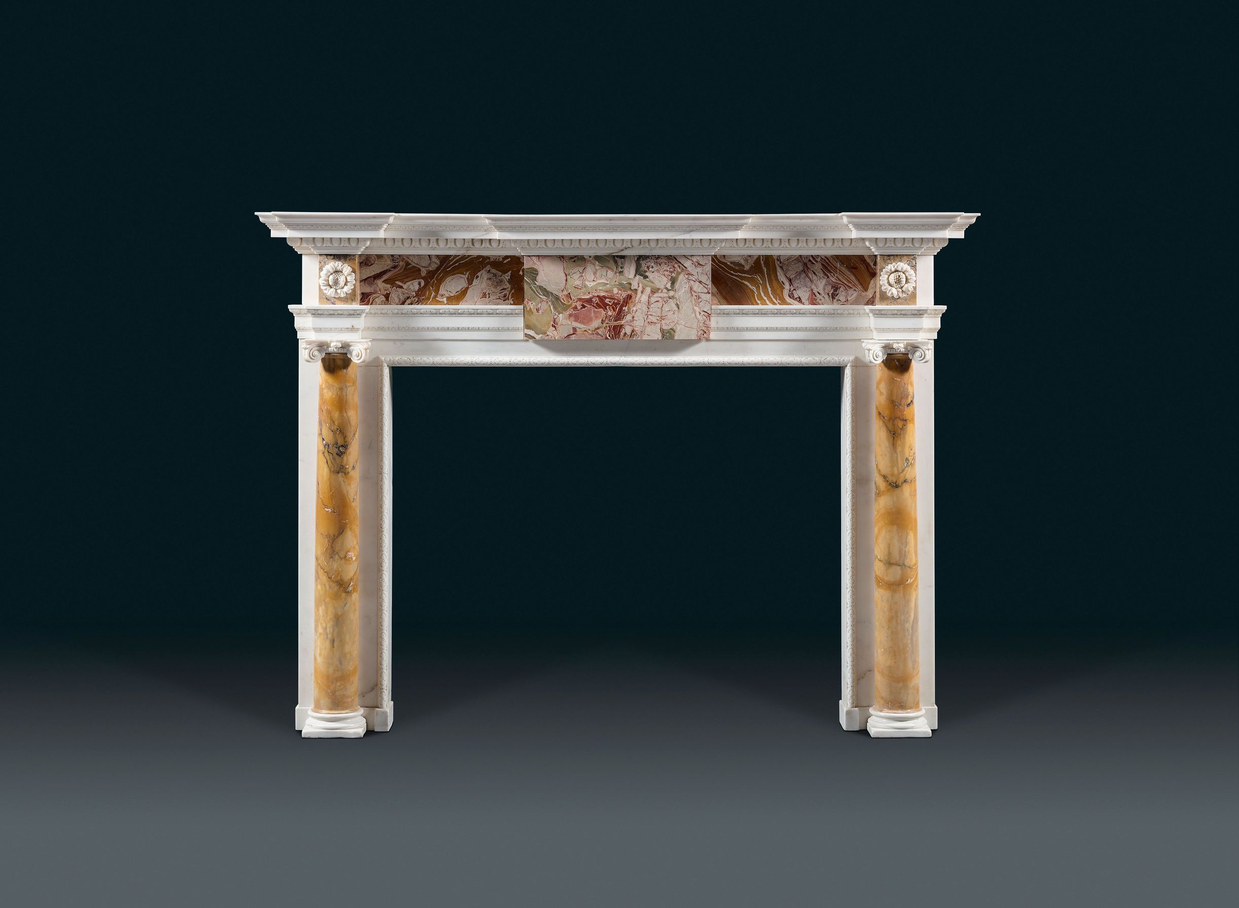 An Impressive 18th Century Palladian Style Fireplace in Statuary and Contrasting Jasper Marbles with Sienna Marble Column Jambs