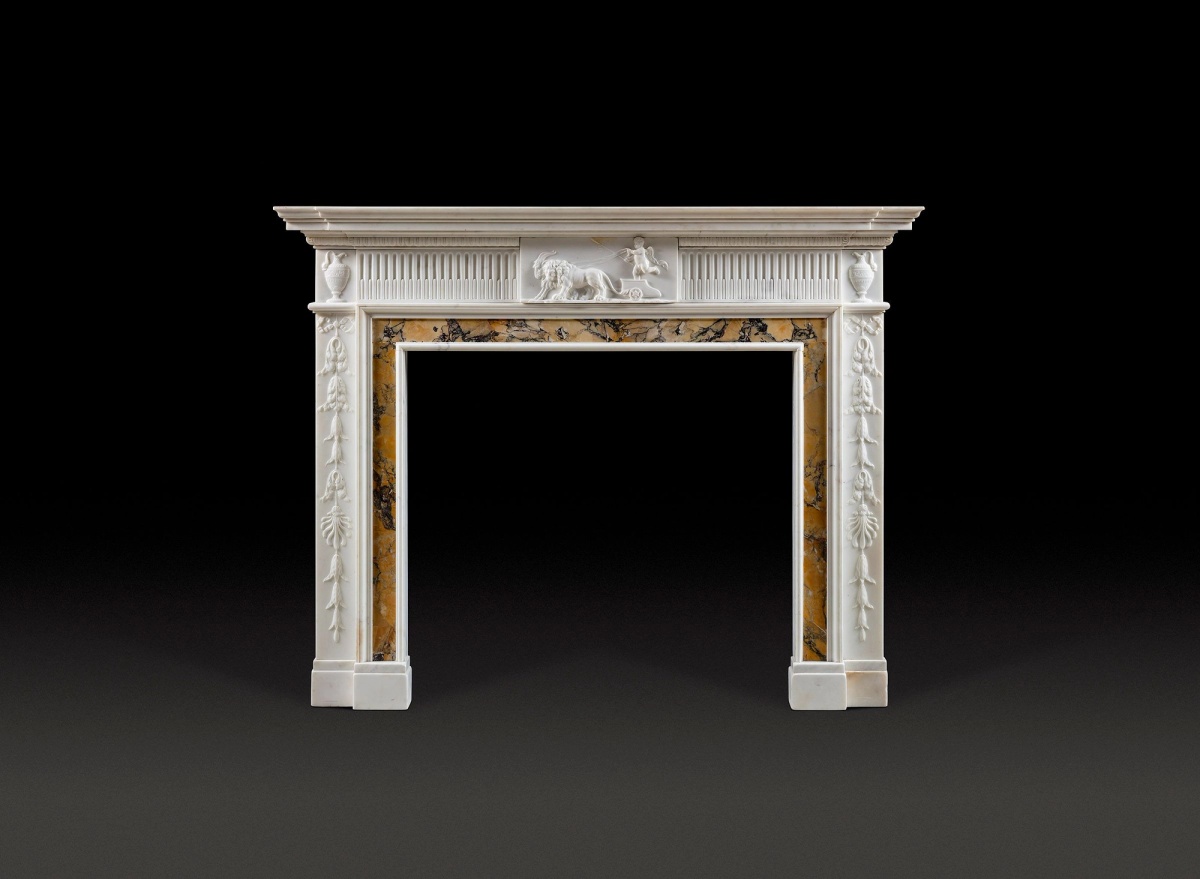 The central tablet depicts an exceptionally well carved putto driving a chariot drawn by a lion and a ram, showing the God’s ability to tame all animals in nature. This is flanked by replaced frieze panels, carved with running finger flutes. The recessed corner blocks bearing exquisitely detailed carved urns, above jambs carved with bows, and hanging acanthus and anthemion floral motifs in low relief. The inground veneered with S-cut Siena marble of high quality.