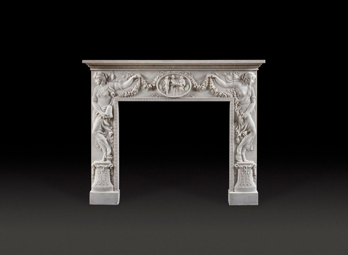 A neoclassical chimneypiece commemorating the peace between Great Britain and the United States of America. Circa 1777–1791.