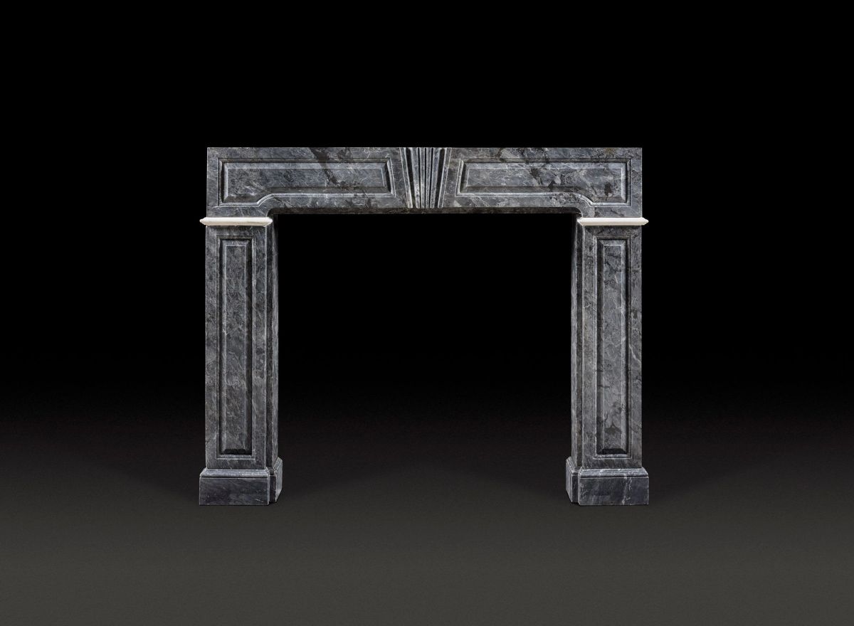 A George I early 18th-century frame chimneypiece in dark Italian Bardiglio marble, punctuated by bed moldings in statuary. The frieze and jambs are incised with fielded panels, centred by a tapering keystone.