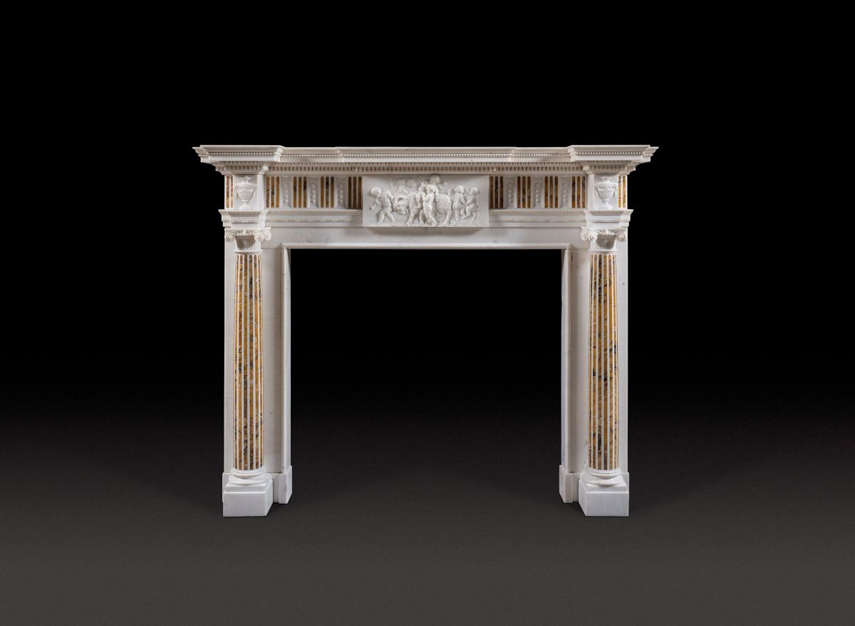 A late 18th-century style chimneypiece in statuary and Siena marbles of truly exceptional quality.