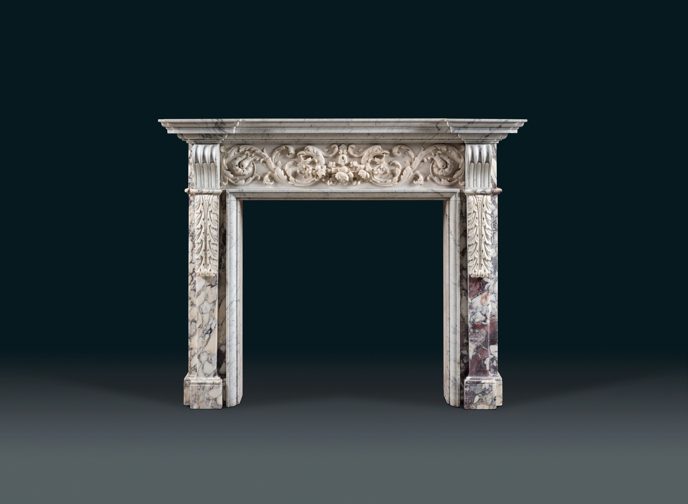 A robust and very fine mid-eighteenth-century Palladian chimneypiece, carved from exquisite Breche Violette, Statuary and Old English marbles. Upon the frieze, a sumptuous festoon of flowers suspends from the beaks of opposing eagles, their bodies transfigure into winding S scrolls of Acanthus leaf. The jambs feature simple, tapering Breche pilasters, faced with contrasting Statuary acanthus leaves. A medley of marbles and painterly veining contribute to the piece's overall sumptuous and harmonious design. A statuesque shelf projects over stop-flute corner blocks. The piece is in excellent condition, with carefully executed later restorations.