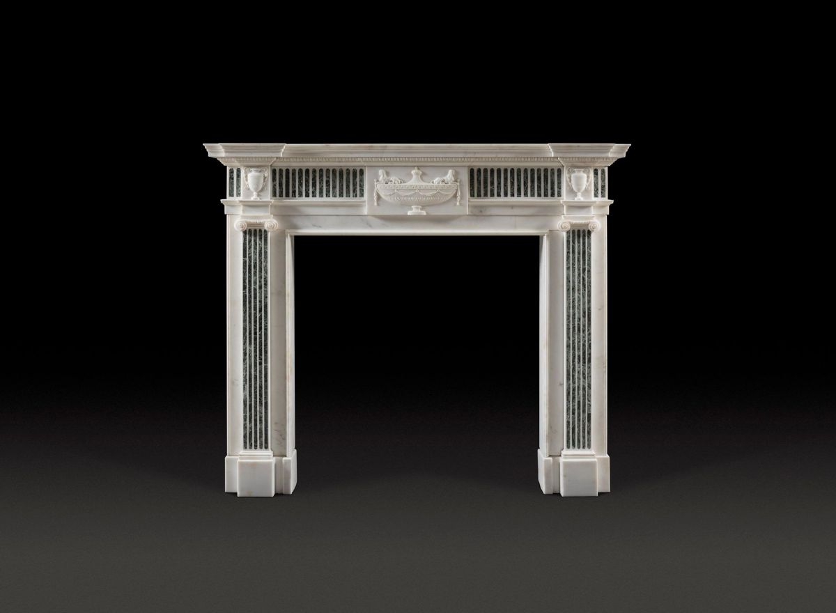 An exquisite late 18th-century chimneypiece of Robert Adam’s design. The inverse breakfront molded shelf rests on an inlaid frieze. The central tablet depicts a classical urn with Sphynxes and garlands, while the corner blocks are carved with smaller urns. The jambs are also inlaid with Tinos marble and these terminate in Ionic pilasters.
