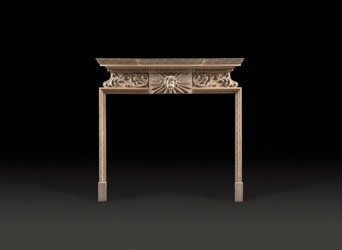 The central tablet with the head of Aurora, God of the dawn in the sunburst of the new day, flanked by a frieze enriched with generous sprays of acanthus leaves, capped with a tiered shelf punctuated by finely carved dentils, egg & dart, and bead & reel moldings. With some later restorations and replaced elements.