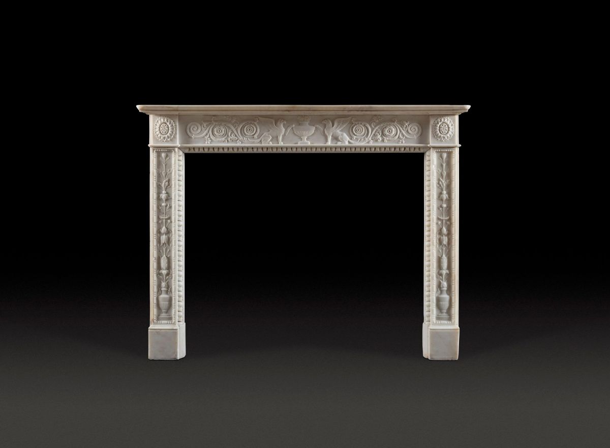 A neoclassical fireplace, produced in Italy most probably for the English Market, in the manner of Lorenzo Bartolini (1777–1850). The gracious and elegant composition is typical of Bartolini’s style, merging Greek and Roman decorative elements with the inventiveness of the Florentine Qauattrocento. The frieze is centred by a tazza urn upheld by a pair of griffins, their tails turning into stylised scrolling acanthus. The opening is framed by very fine under-scale egg & dart motif, and the jambs are carved with a variety of exotic antique foliage, ending with sunflowers on the cornerblocks.