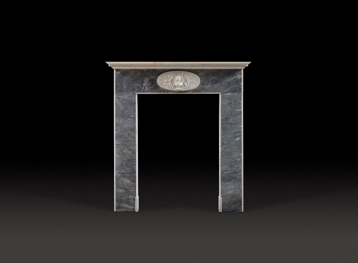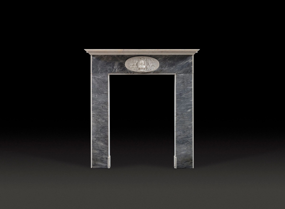 A Refined Late 18th to Early 19th Century Chimneypiece Carved in Bardiglio and White Marble.