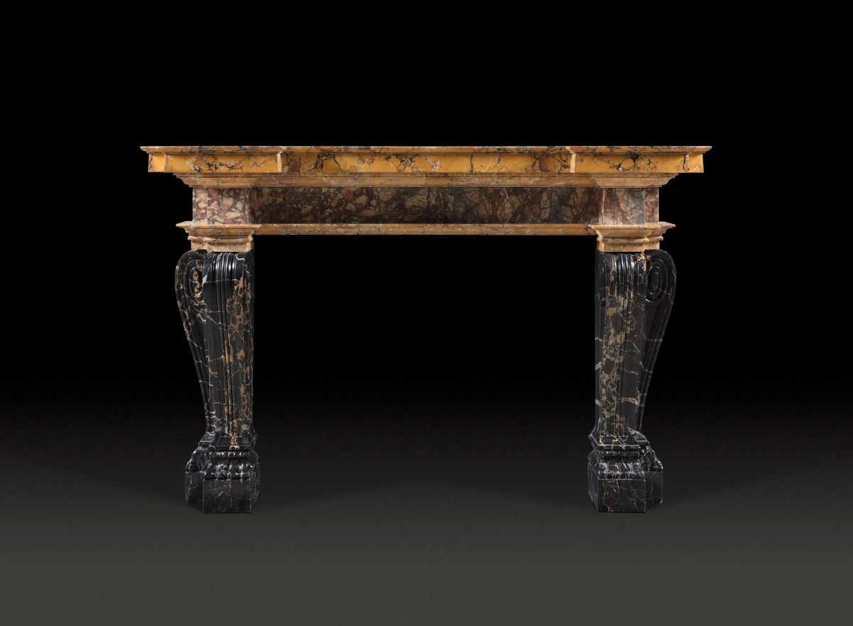Frescoed by artists of the calibre of Raphael and Sebastiano del Piombo, the Villa also boasts a rich array of coloured marble furnishings, pilasters, columns, door frames, floor slabs, and fireplaces, where the warm tonalities of Giallo di Siena are often contrasted with the darker ones of Marmo Africano, in a colour combination similar to that of the present chimneypiece. A pietre dure fireplace designed by the sixteenth-century architect Giacomo Barozzi da Vignola for the Salone di Ercole in Palazzo Farnese, the palace commissioned by future Pope Paul III in the heart of Rome in 1515, further illustrates the use of coloured marbles in Renaissance interiors, a tradition that gradually extended to other European courts and, with the age of the Grand Tour, reached Britain.