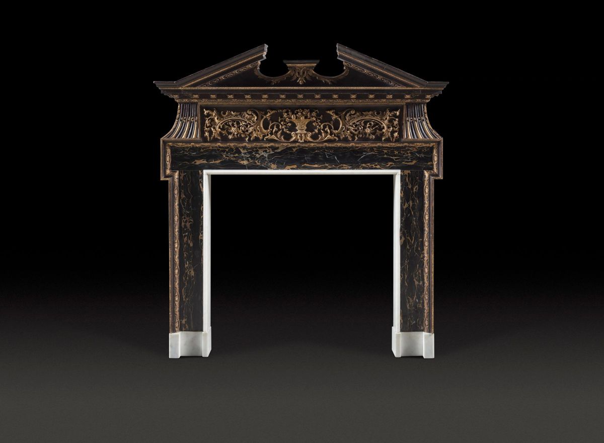 The central frieze is carved with a Rococo vase of flowers, flanked by scrolling motifs. This supports a broken pediment with acanthine modillions to the under-mould. The opening frame is made of Portoro marble ingrounds, standing on white marble footblocks. The strong Palladian presence married with Rococo ornamental details leads to the manner of the James Paine, a successful mid 18th century Palladian revival architect and early exponent of Rococo interior decoration.