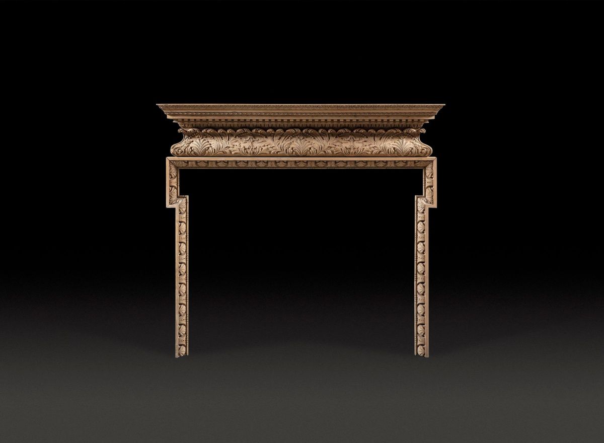 The tiered shelf is punctuated by finely carved dentils, egg and dart, and acanthus ornamental details. This is supported by an elegant acanthus leaf frieze with beading. The slender dog leg jambs, carved with leaf and dart motif and a bead and reel molding framing the opening. This chimneypiece is designed to stand on marble foot blocks which will increase the height and presence of the chimneypiece along with a set of slips with bullnose returns.
