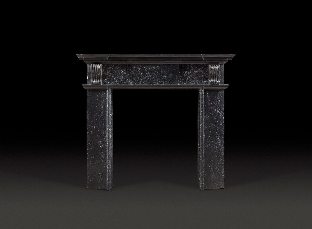 An 18th Century Irish Palladian Chimneypiece Carved in Black Kilkenny Marble.