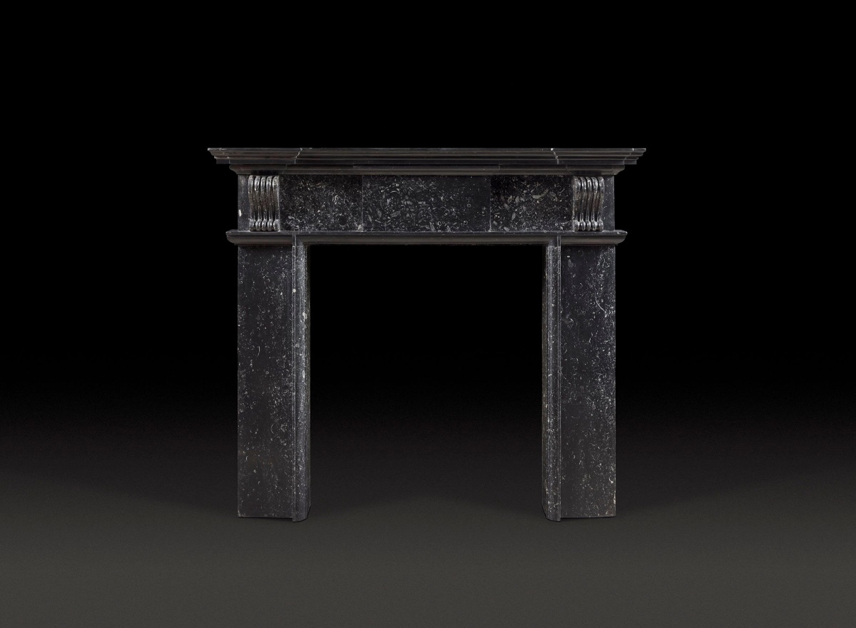 An Irish Black Kilkenny fossil marble from the 18th century. The limestone header and jambs are packed with fossils of seashells and coral. A moulded, tiered, breakfront shelf sits atop a plain frieze with an uncarved tablet at its centre. The jambs are capped with scrolling brackets. This piece of Palladian architectural design is powerful in its simplistic beauty.
