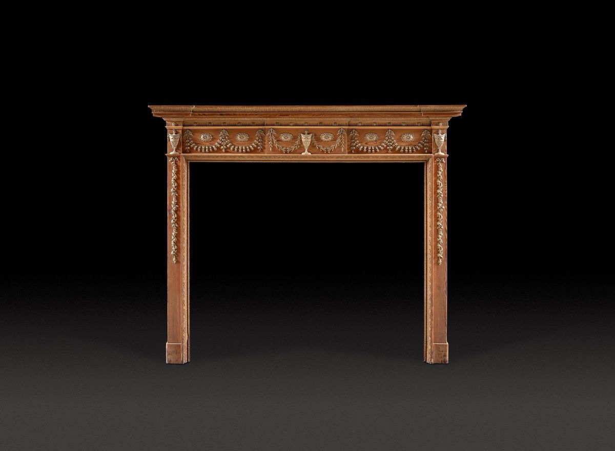 Featuring slender Jambs and a finely tiered breakfront shelf, this chimneypiece presents festoons, beading, waterleaf moulding and classical urns in the Adam style.