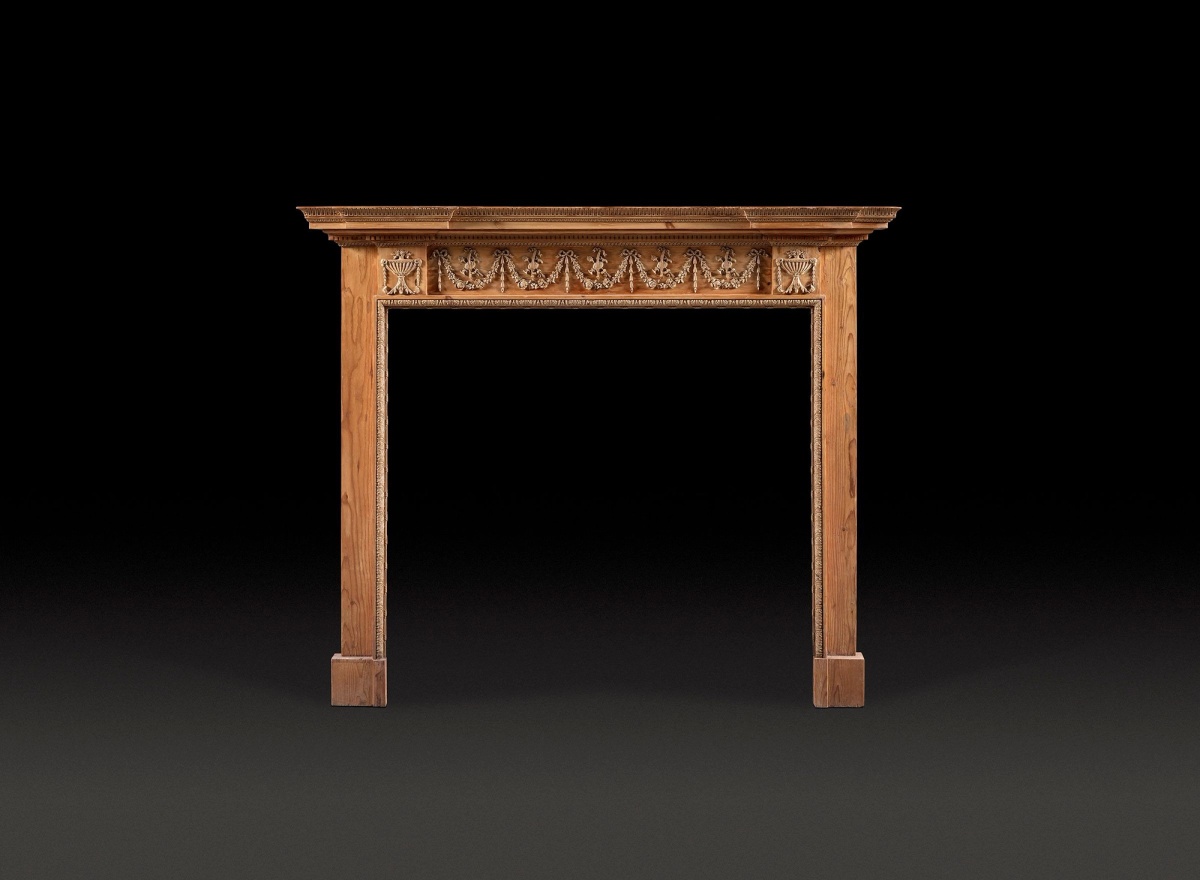 A finely drawn, late eighteenth century, pine and gesso chimneypiece featuring a breakfront shelf and a frieze depicting a motif of crossed claret jugs and flaming torches. On the corner blocks are carved, Adam-style urns with rams heads and acanthus leaves whose fine carving contrasts the fluid, unbroken gain of the stripped pine on the jambs.