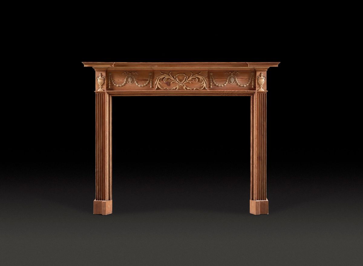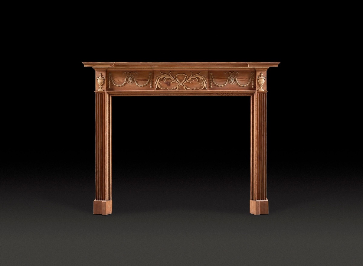 A chimneypiece of good, neoclassical proportion with canted foot blocks and fluted jambs. On the central tablet are two onions, bound by a ribbon, their organic forms well carved. Foliate swags, hung from paterae, decorate the frieze and urns mark the corner blocks.