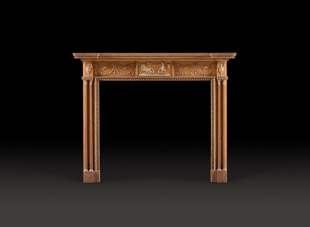A Late Eighteenth Century, Pine and Gesso Chimneypiece with Fluted Pilaster Columns and a Central Tablet Depicting Venus, or Perhaps Aurora, on a Chariot.