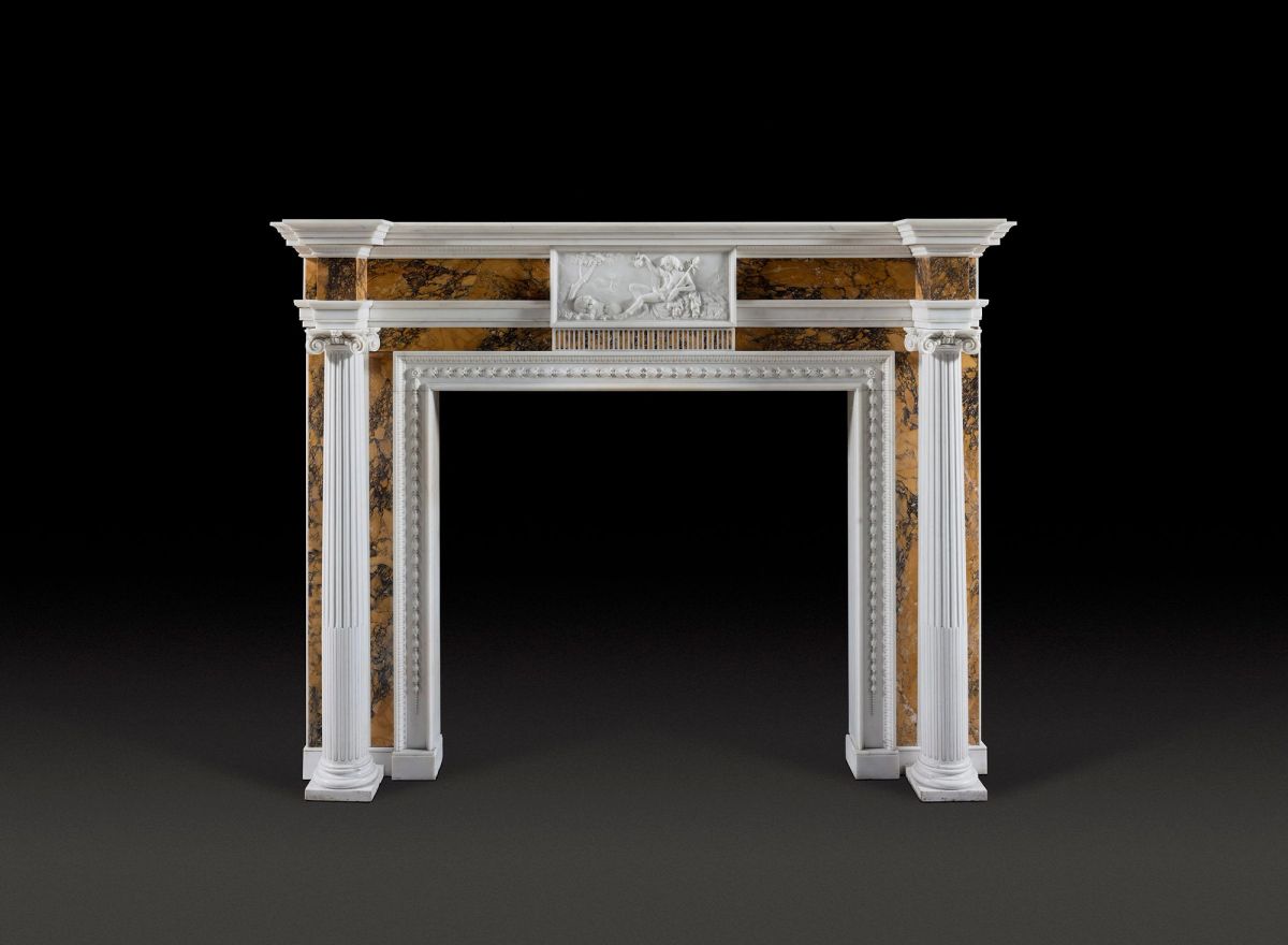 An imposing late 18th century Irish chimneypiece in Italian Statuary and richly coloured and strongly veined Convent Sienna Marbles from circa 1790. Upward tapering ionic, reeded, and unengaged columns of statuary marble dominate the aesthetic of this piece and provide further framing to a central tablet. This is carved with the scene of Bacchus (Dionysus), the god of wine, depicted here with his stick named Thyrsus and a lion who is turned back towards him with a snarl. Thyrsus, often carried by Bacchus, has at one end a pinecone, the phallic shape symbolising fertility. The message here might be the conquering of humans over nature, or otherwise a gift for good fortune in fertility. This tablet is particularly special and fine given its shallow depth which increases its delicate nature, more commonly seen in later Palladian architecture. It is upheld by a run of Sienna finger flutes. The frieze, corner blocks, and rear jambs are of the finest Convent Sienna veneers. Corner blocks project over the ionic columns. A thin line of lamb's tongue moulding supports the breakfront shelf, and the piece is finished with a particularly sumptuous inground with lambs' tongue and running bell flowers, a symbol of everlasting love.