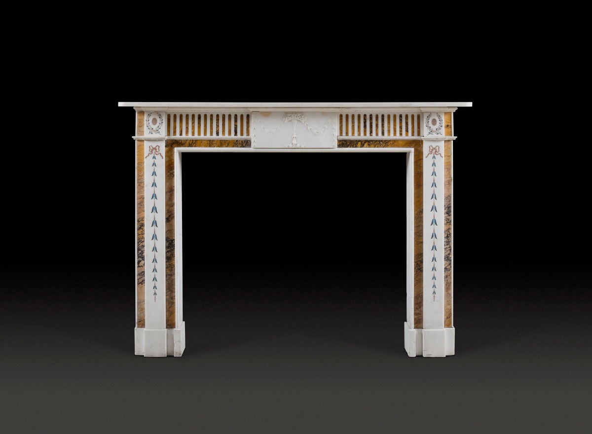 A fine late 18th century Irish Neoclassical chimneypiece in Statuary marble with richly coloured and figured Convent Siena marble flanking the pilasters and framing the aperture. The legs are decorated with bell flowers hanging from bows in scagliola in the manner of Pietro Bossi, circa 1790. Corner blocks feature budding laurel wreaths around oval patera, reminiscent of intaglio rings. The central tablet offers a decorative floral bouquet with festoons of bell flowers and is flanked on either side by inlaid finger flutes. The piece falls at a transitional point in style heading from Georgian to Regency design.