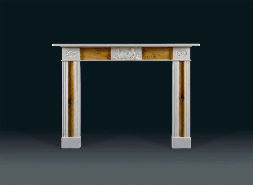 A statuary and Siena marble chimneypiece, late 18th century, circa 1795. With moulded shelf with rounded corners above the frieze, which is centred with a tablet of a reclining goddess Venus (beauty) accepting a gift of a basket of flowers from her winged son Cupid (love). This is flanked by panels of Siena and, at the ends, blockings with oval-shaped flower heads in ovals. The pilaster-shaped jambs with Siena sandwiched between cyma-decorated mouldings. The whole on foot blocks.
