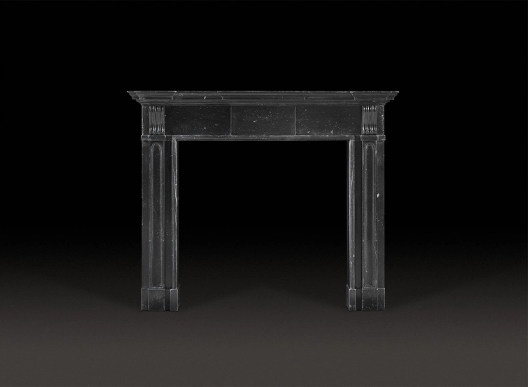 An early architectural Palladian, Irish antique fireplace of black Kilkenny marble, with moulded tiered shelf and plain frieze centred with an uncarved tablet. The pilaster jambs are incised with rounded arched decoration, each capped with scrolling brackets. Circa 1745.