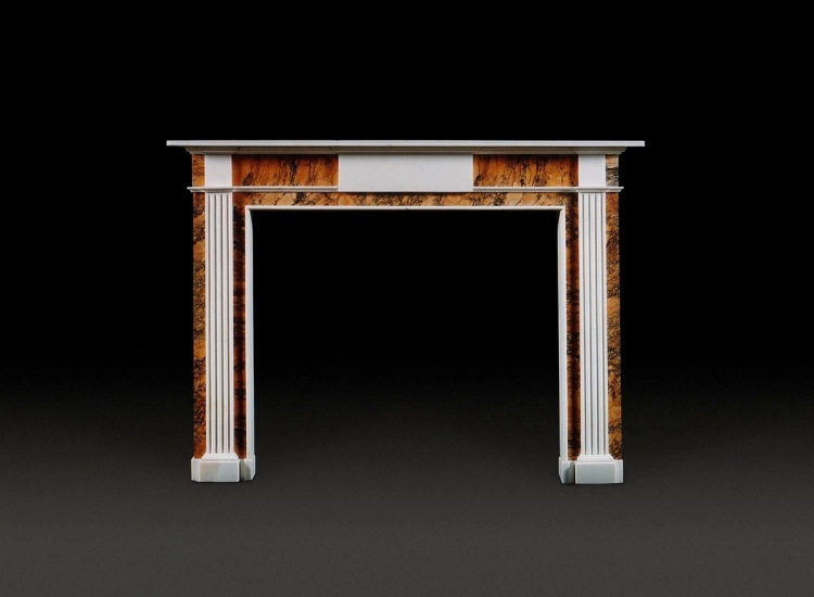 An exceptionally fine and well-proportioned early 19th century Regency Siena and Statuary marble chimneypiece. The plain central tablet flanked by blank corner blockings above fluted pilaster jambs on Siena grounds. The severe architectural design serves to accentuate the exceptional quality of the darkly figured Convent Siena. Circa 1810.
