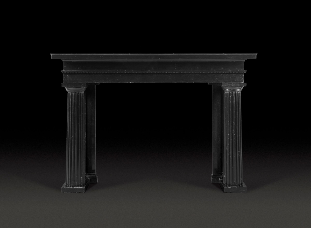 A Regency chimneypiece of scale and presence, the whole carved from Belgian Black marble, with fluted Doric columns for jambs. These columns employ entasis, the application of a gentle convex curve to correct the human eye's tendency to see a straight column with a slight concave curve. This resonant piece carries great impact and presence with its architectural nature evoking ideas of a classical temple.