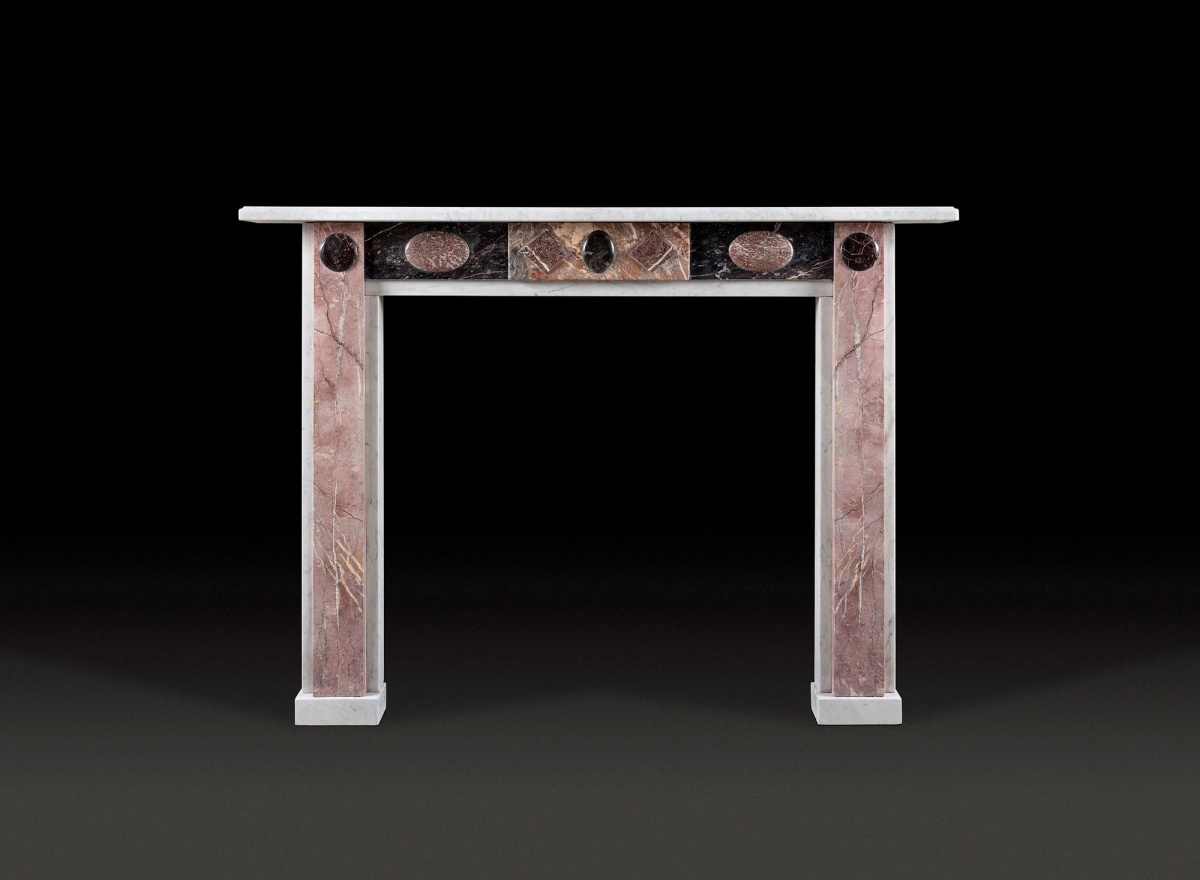 A well proportioned Regency fireplace showing cabochons on the frieze carved in rare materials from the ancient tropical coral seas of Britain. An oval in 'Featherstone' fossil at centre is flanked by petitor bookmatched diamonds at the sides and fine Ashburton roundels as cornerblocks.