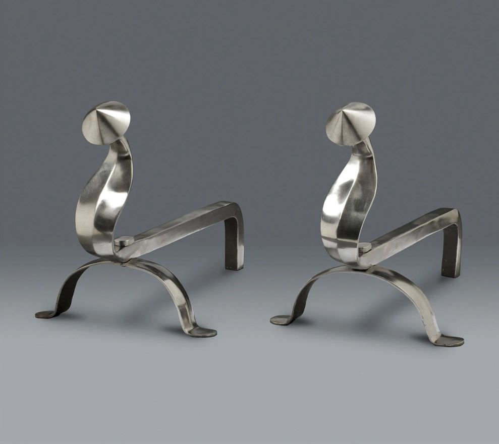 Polished forged steel andirons with gracious line and sensuous curves, combing the skills of a master blacksmith and the aesthetic designs of the Art Nouveau movement.