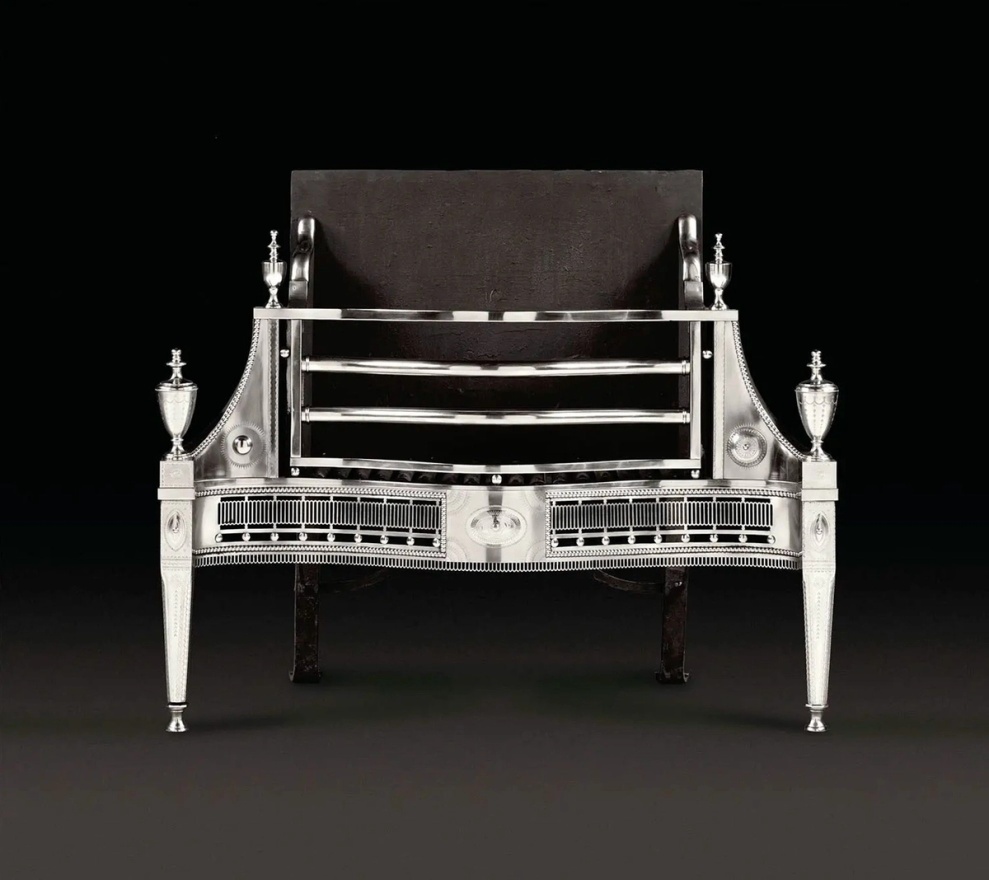 This richly decorated, polished steel fire basket has delicately engraved legs, finials and pieced serpentine apron. Reminiscent of the fire, bright-cut steel work of Mathew Boulton in the 1770s, the design illustrates beautifully the Robert Adam inspired transition from the Palladian to Neoclassical style; with weight and power, yet light elegant lines, bound by strict classical proportions.