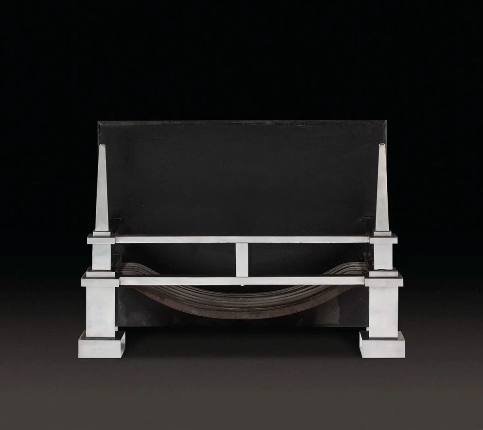 An early George III style steel fire grate, the uprights take the form of obelisks on double tiered pedestals. This grate, made with or without obelisks, is unflinchingly austere whether large or small, hand- finished in polished steel, antique brass or blackened.
