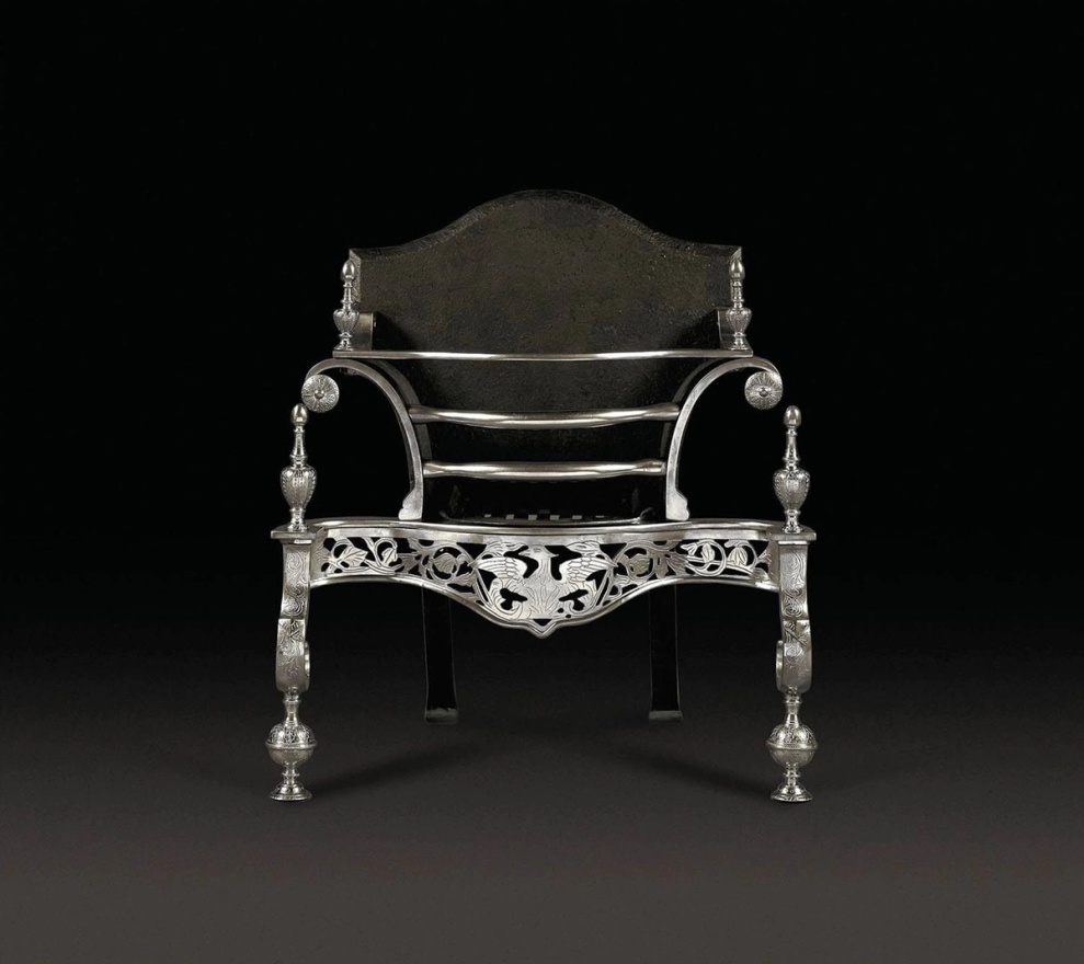 The nickel Playfair fire basket reflects the Rococo style of the mid 18th Century. In 1751, a Swedish chemist, A. F. Constedt, invented the nickel, or ‘German silver’ – an alloy of copper and zinc – from which this fire basket is made. The pierced serpentine apron is decorated with a phoenix, the ‘fabulous bird of the classics’ that rose from the ashes. Available in polished brass, steel or nickel.