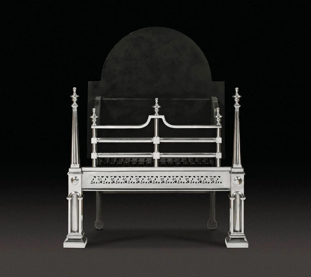 This faithful reproduction of a rare 18th century double stove fire grate with legs in the form of urn capped obelisks, mounted on architectural plinths, joined by a pierced apron, is typical of Leeds ironmonger Maurice Tobin’s Neoclassical style. Tobin’s obituary of 1773 describes him as ‘the most eminent in his profession’.