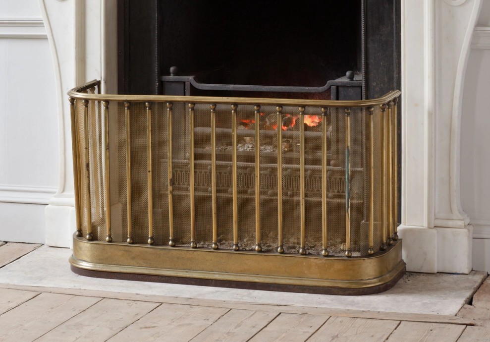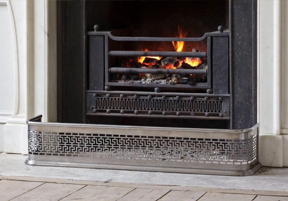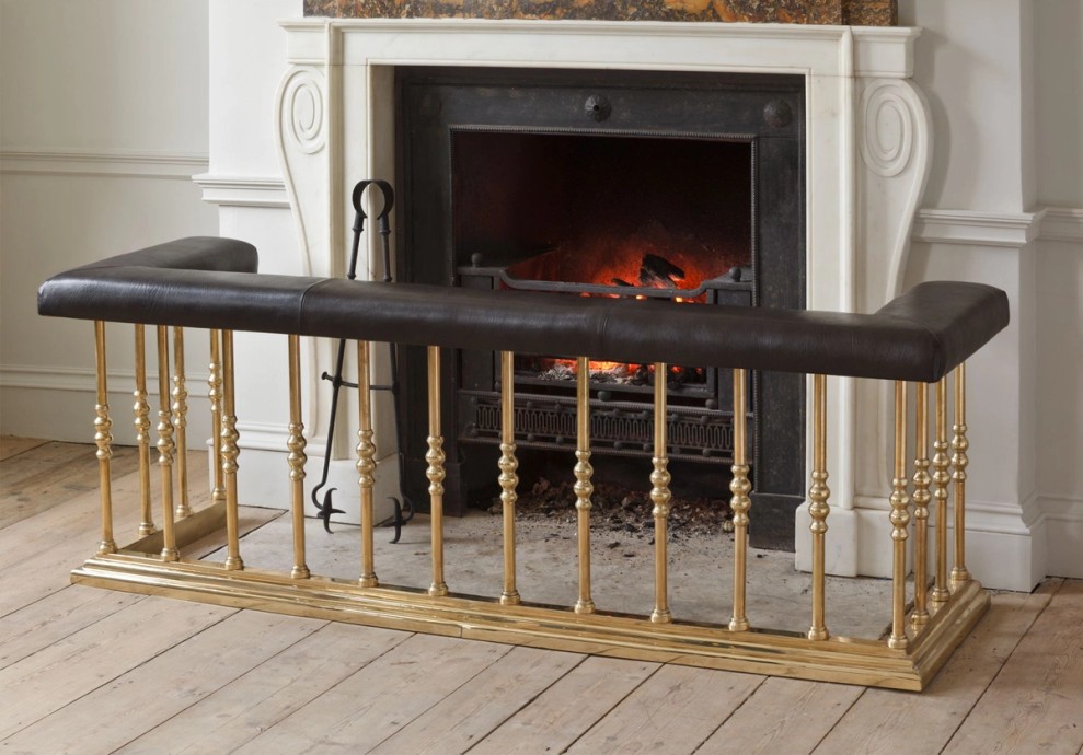 The Chamber fire guard is a small, polished brass fire guard with moulded base and turned uprights with a protective mesh, while the Club a more traditional with leather upholstered seat and moulded polished brass base. The Greek Key is a lower fire guard with double bands of pierced Greek key fret work while the taller Nursery fender, a faithful copy of an early 19th-century fire guard, provides ultimate protection combined with the elegance of moulded brass and finely worked mesh.