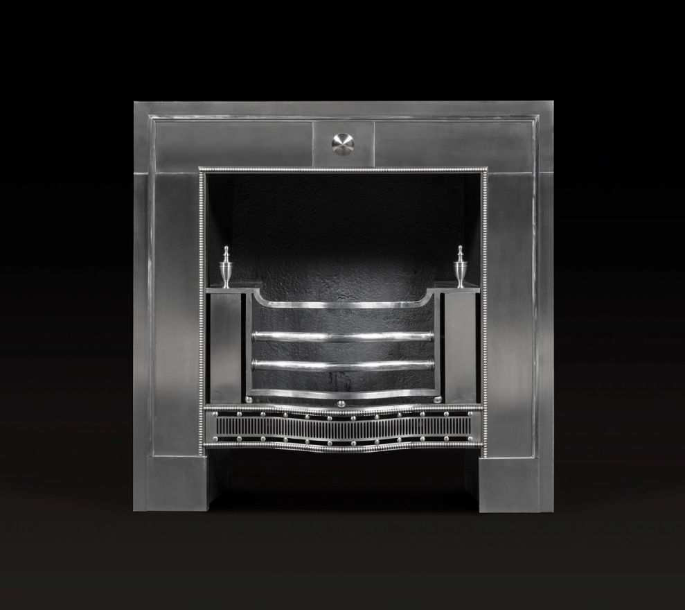 An 18th century style steel register grate of simple but pleasing Neoclassical Adam design. The enclosed firebox with four curved horizontal bars to the front, above a curved apron with pierced fluted decoration upheld by upright panels capped with elegant urn finals. The surrounding inset metal slips with running pearl around the opening. The top centred with a rectangular plaque with applied escutcheon.