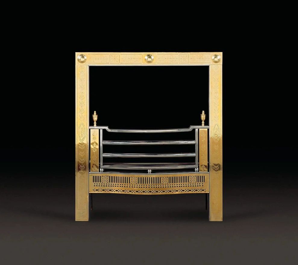 Dublin grate makers like Binns and Clarke perfected their art in the late 18th Century. Typical of such designs, this brass register grate with polished steel bars is enlivened by etched foliage decoration, turned finials and an intricately pierced apron.